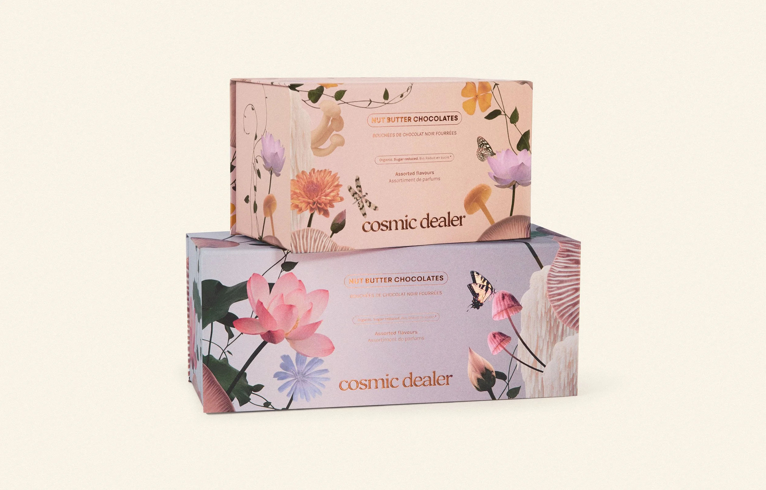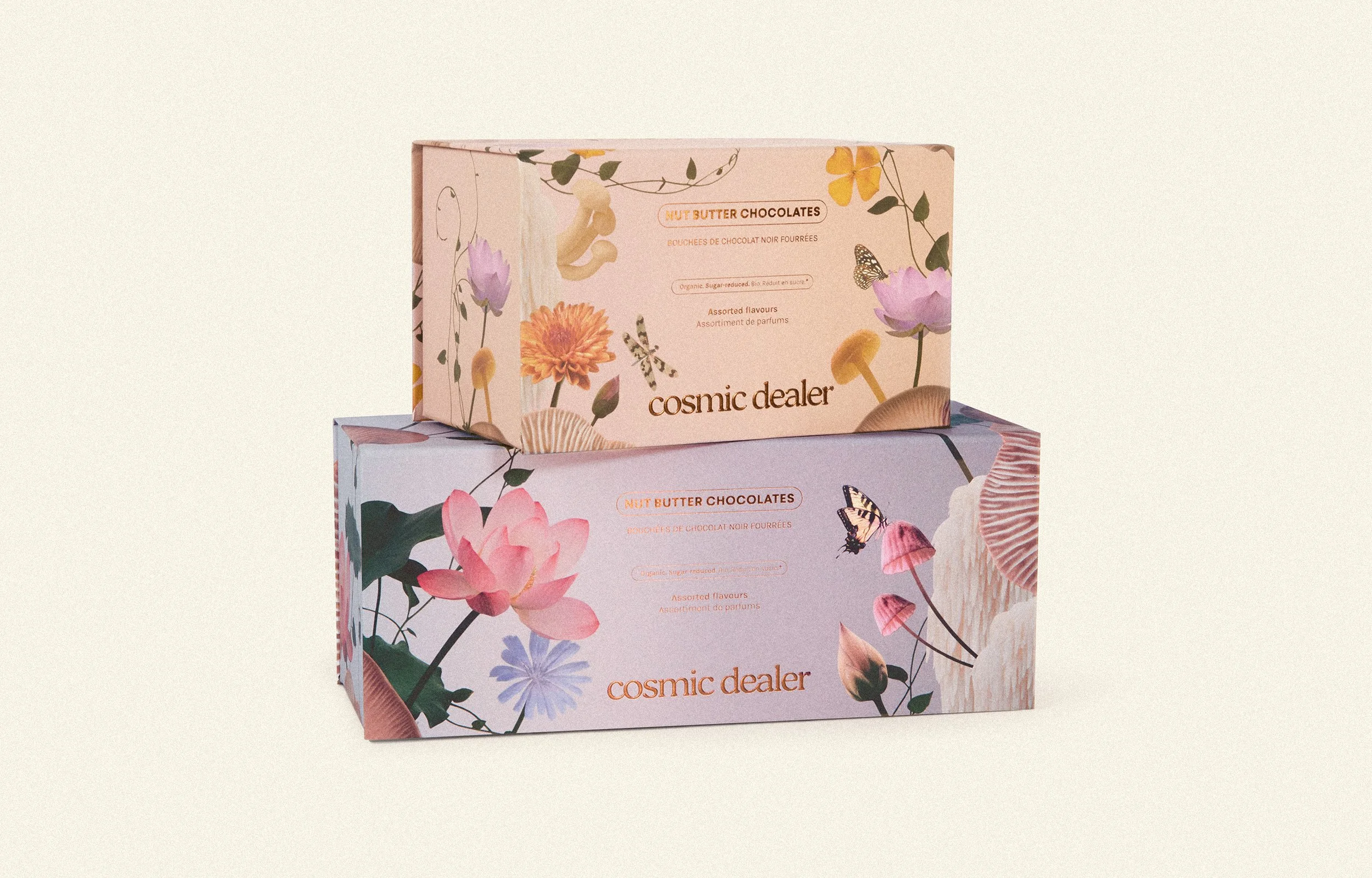 Visual identity, digital content and packaging design for Cosmic Dealer, a brand inspired by Indian ayurveda, offering wellness and delicatessen products.